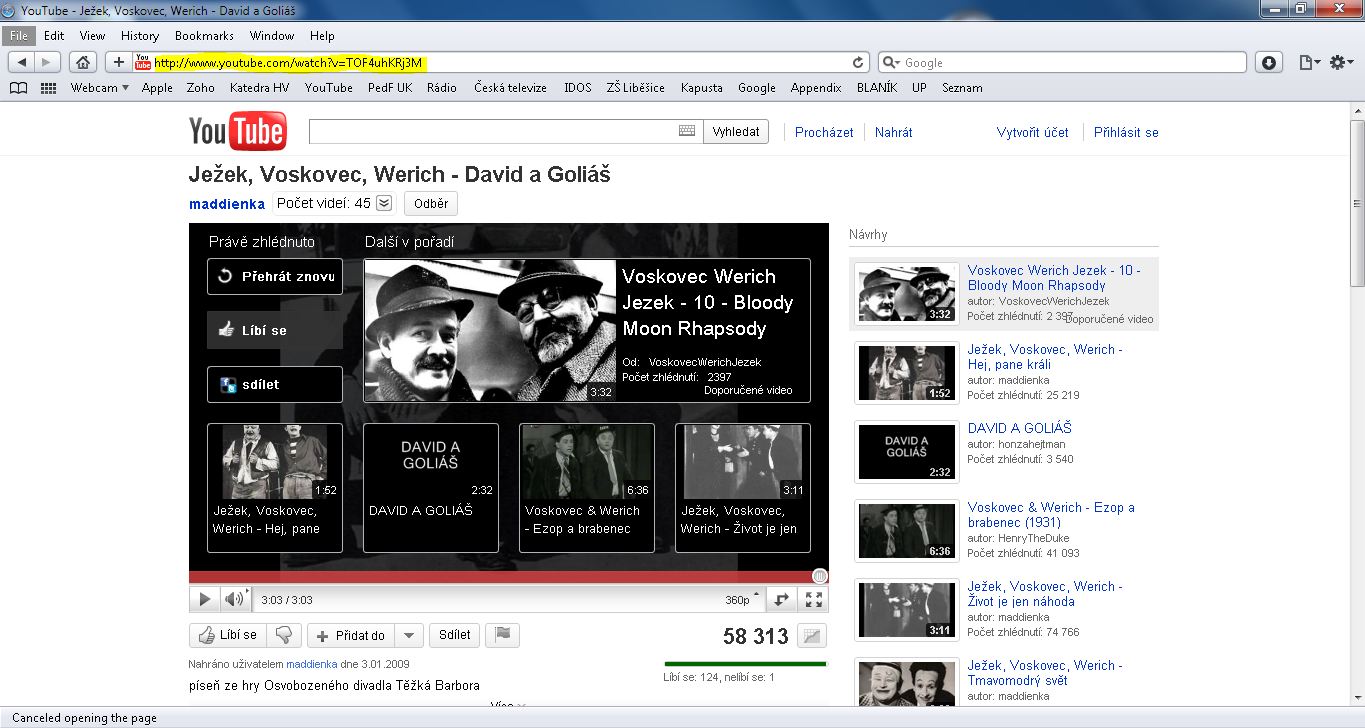 Prvním krokem bude najít stránku Youtube (www.youtube.com) a tam vyhledat naše video Ježek, Voskovec, Werich - David a Goliáš. Video spustíme a tím jsme splnili první krok.
