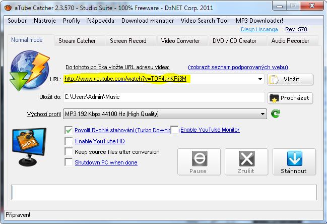 Po spuštění programu se objeví malé okno, kde je nutné dopolnit nebo nastavit celkem tři parametry. První je doplnit URL - to jsme získali ze stránky YouTube. Jak ukazuje obrázek, již jsem to tak udělal.