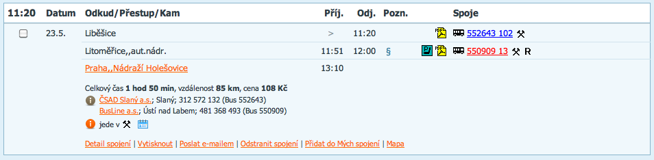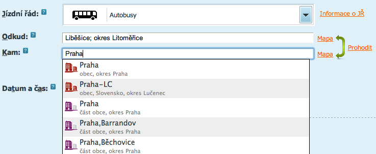 Zde naleznete základní nabídku na vyhledávání podle druhu doprvního prostředku. První úkol: Najděte mi spojení z Liběšic do Prahy autobusem. Chtěl bych tam přijet ve 12 hodin.
