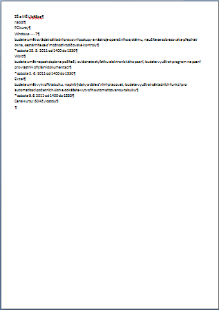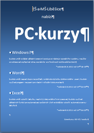 V tomto testu nelezneš dva soubory. Ten barevný je tvůj úkol - plakát na školení PC kurzy. Abys nemusel všechny texty vypisovat, což by jistě trvalo, stáhni si do počítače druhý soubor. Ten obsahuje textové podklady plakátu.